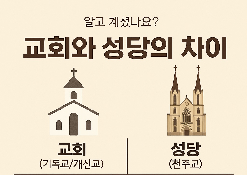 • 성당은 지역이나 규모에 상관없이 표준화된 예배와 분위기를 제공하지만, 교회는 교단, 목회자, 지역에 따라 차이가 큽니다.