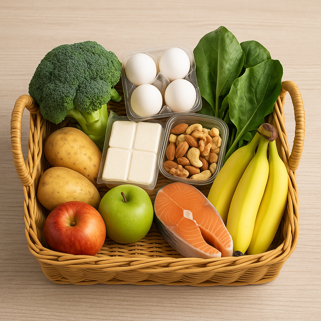 • 닭가슴살, 두부, 계란, 연어, 현미밥, 채소(시금치·브로콜리·상추), 과일(바나나·사과), 견과류