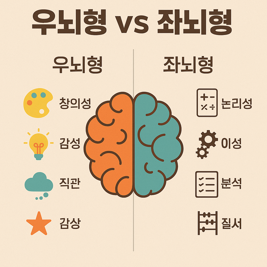 좌뇌형과 우뇌형은 좌뇌와 우뇌가 각각 다른 기능을 담당하며, 사람이 한쪽 뇌를 더 많이 사용해 논리적이거나 창의적인 성향을 가진다는 개념으로 널리 알려져 있습니다.