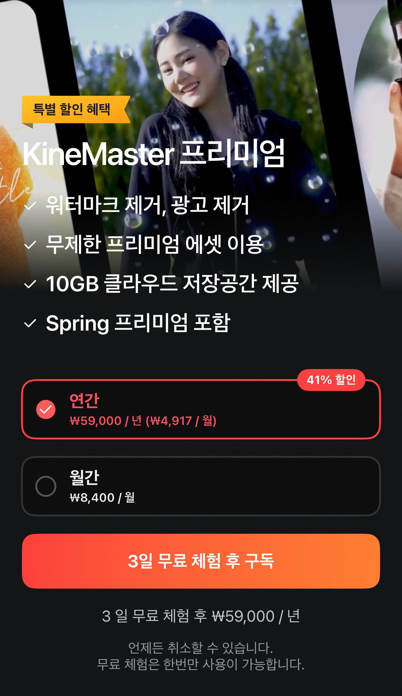 키네마스터는 좀 더 전문적인 편집을 원하는 사용자에게 적합합니다. 컷 편집, 자막, 음악, 효과음, 다양한 필터와 전환, 크로마키(배경 합성), 리버스(역재생), 오디오 추출 등 고급 기능이 풍부합니다. 에셋 스토어를 통해 다양한 효과, 폰트, 음악, 전환 등을 추가로 다운로드할 수 있어 영상의 완성도를 높일 수 있습니다. 편집 화면은 가로 모드라서 컷 편집이나 세밀한 작업에 유리합니다. 다만, 무료 버전에는 워터마크가 들어가고, 모든 기능을 쓰려면 월 또는 연간 구독이 필요합니다. 가격 부담이 블로보다 큽니다. 또한, 기능이 많다 보니 처음 접하는 사람에게는 다소 복잡하게 느껴질 수 있습니다.